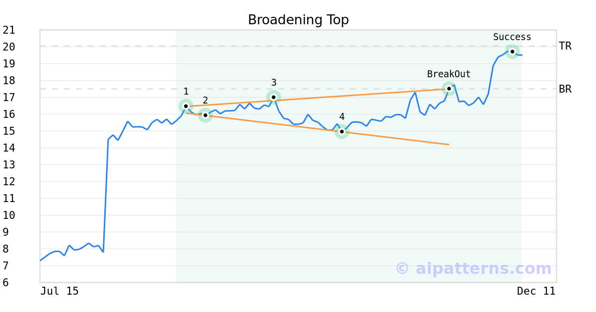 On November 11, 2025, A.I.dvisor detected a Broadening Top Pattern (Bullish) for CommScope Holding Company (COMM, $17.50). On November 11, 2025, A.I.dvisor confirmed the Bullish pattern, setting a target price of $20.05. 20 days later, on December 01, 2025, COMM reached the target price resulting in a +1 for traders who took a long position in the stock.