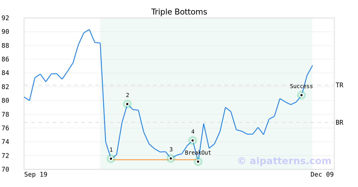 On November 04, 2025, A.I.dvisor detected a Triple Bottoms Pattern (Bullish) for Corcept Therapeutics (CORT, $71.10). On November 04, 2025, A.I.dvisor confirmed the Bullish pattern, setting a target price of $82.24. 28 days later, on December 02, 2025, CORT reached the target price resulting in a +1 for traders who took a long position in the stock.