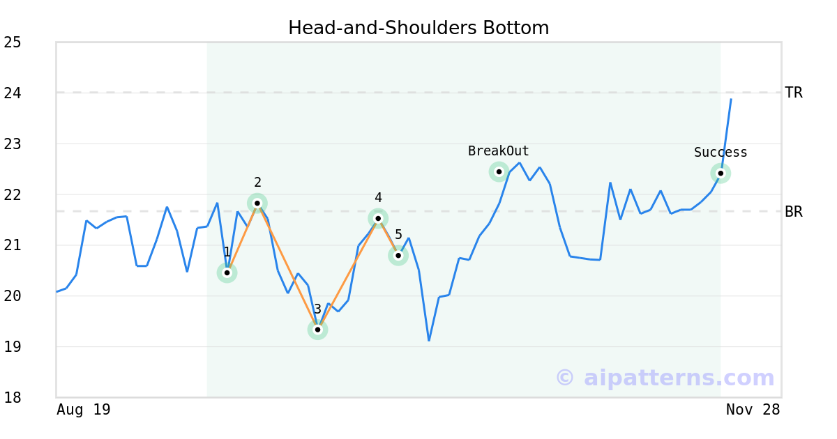 On October 07, 2025, A.I.dvisor detected a Head-and-Shoulders Bottom Pattern (Bullish) for Capri Holdings Limited (CPRI, $20.79). On October 21, 2025, A.I.dvisor confirmed the Bullish pattern, setting a target price of $24.01. 30 days later, on November 20, 2025, CPRI reached the target price resulting in a for traders who took a long position in the stock.