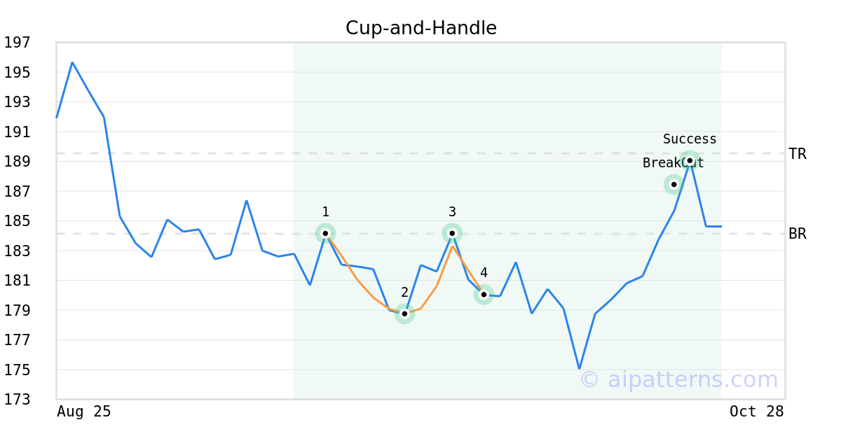 On October 02, 2025, A.I.dvisor detected a Cup-and-Handle Pattern (Bullish) for Crane Company (CR, $180.02). On October 20, 2025, A.I.dvisor confirmed the Bullish pattern, setting a target price of $189.54. 1 day later, on October 21, 2025, CR reached the target price resulting in a for traders who took a long position in the stock.