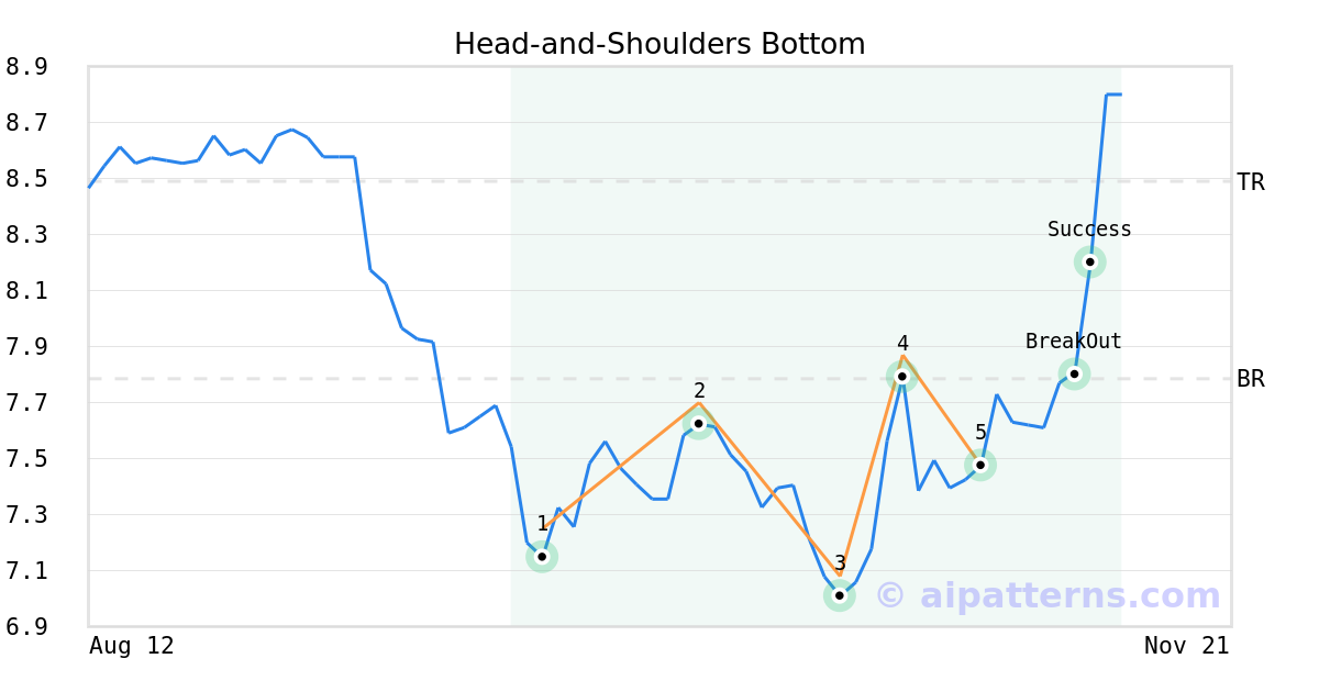 On October 31, 2025, A.I.dvisor detected a Head-and-Shoulders Bottom Pattern (Bullish) for Cross Timbers Royalty Trust (CRT, $7.48). On November 10, 2025, A.I.dvisor confirmed the Bullish pattern, setting a target price of $8.49. 1 day later, on November 11, 2025, CRT reached the target price resulting in a for traders who took a long position in the stock.