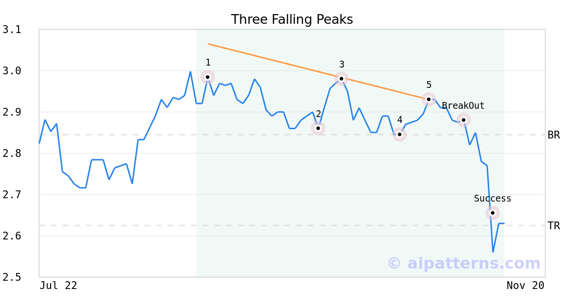 On October 24, 2025, A.I.dvisor detected a Three Falling Peaks Pattern (Bearish) for Crown Crafts (CRWS, $2.93). 10 days later, on November 03, 2025, A.I.dvisor confirmed the Bearish pattern, setting a target price of the stock. On November 10, 2025, the stock hit the target price of $2.63 – resulting in a gain for traders who shorted the stock on the pattern detection date.