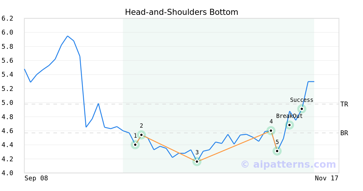 On November 04, 2025, A.I.dvisor detected a Head-and-Shoulders Bottom Pattern (Bullish) for Cosan SA (CSAN, $4.31). On November 06, 2025, A.I.dvisor confirmed the Bullish pattern, setting a target price of $4.98. 4 days later, on November 10, 2025, CSAN reached the target price resulting in a +1 for traders who took a long position in the stock.