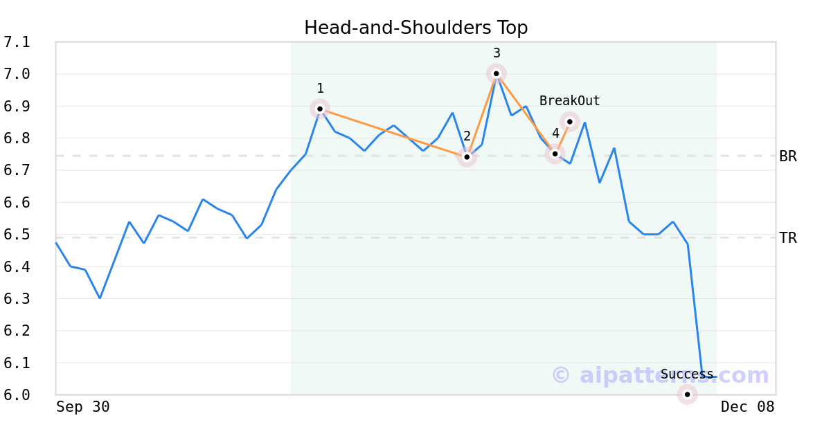 On November 18, 2025, A.I.dvisor detected a Head-and-Shoulders Top Pattern (Bearish) for Champions Oncology (CSBR, $6.85). On November 18, 2025, A.I.dvisor confirmed the Bearish pattern, setting a target price of the stock. On December 01, 2025, the stock hit the target price of $6.49 – resulting in a +1 gain for traders who shorted the stock on the pattern detection date.