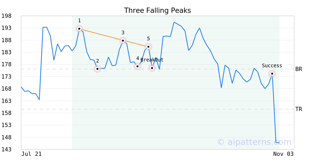 On September 09, 2025, A.I.dvisor detected a Three Falling Peaks Pattern (Bearish) for Commvault Systems (CVLT, $185.22). 1 day later, on September 10, 2025, A.I.dvisor confirmed the Bearish pattern, setting a target price of the stock. On October 27, 2025, the stock hit the target price of $159.56 – resulting in a gain for traders who shorted the stock on the pattern detection date.