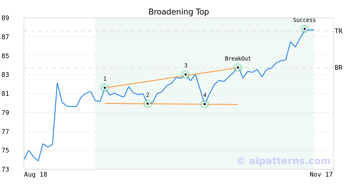On October 21, 2025, A.I.dvisor detected a Broadening Top Pattern (Bullish) for Donaldson Company (DCI, $83.75). On October 21, 2025, A.I.dvisor confirmed the Bullish pattern, setting a target price of $87.62. 20 days later, on November 10, 2025, DCI reached the target price resulting in a for traders who took a long position in the stock.