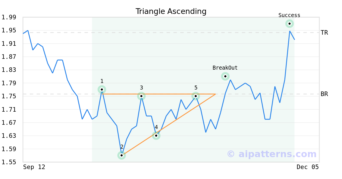 On October 31, 2025, A.I.dvisor detected a Triangle Ascending Pattern (Bullish) for Diana Shipping (DSX, $1.75). On November 10, 2025, A.I.dvisor confirmed the Bullish pattern, setting a target price of $1.94. 18 days later, on November 28, 2025, DSX reached the target price resulting in a +1 for traders who took a long position in the stock.