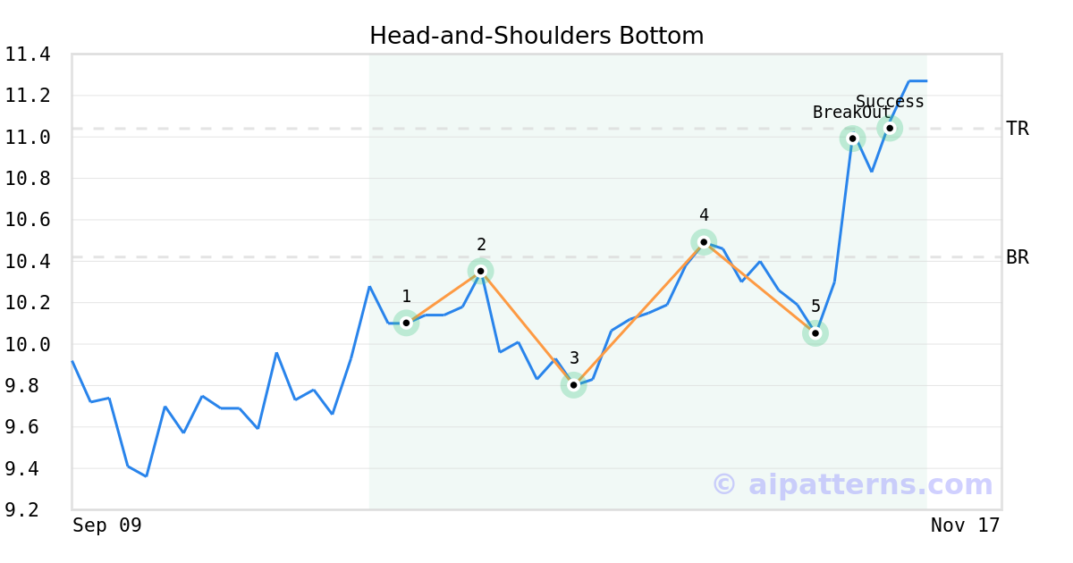 On November 04, 2025, A.I.dvisor detected a Head-and-Shoulders Bottom Pattern (Bullish) for Dynavax Technologies Corp (DVAX, $10.05). On November 06, 2025, A.I.dvisor confirmed the Bullish pattern, setting a target price of $11.04. 4 days later, on November 10, 2025, DVAX reached the target price resulting in a for traders who took a long position in the stock.