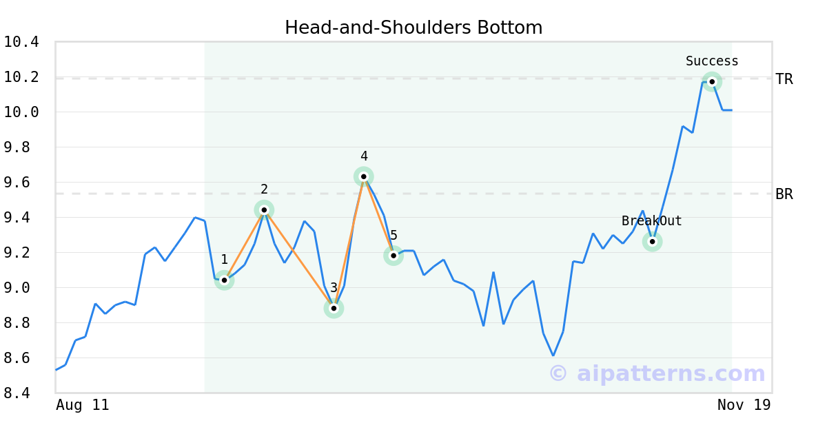 On September 29, 2025, A.I.dvisor detected a Head-and-Shoulders Bottom Pattern (Bullish) for Ecopetrol SA (EC, $9.18). On November 04, 2025, A.I.dvisor confirmed the Bullish pattern, setting a target price of $10.19. 8 days later, on November 12, 2025, EC reached the target price resulting in a +1 for traders who took a long position in the stock.