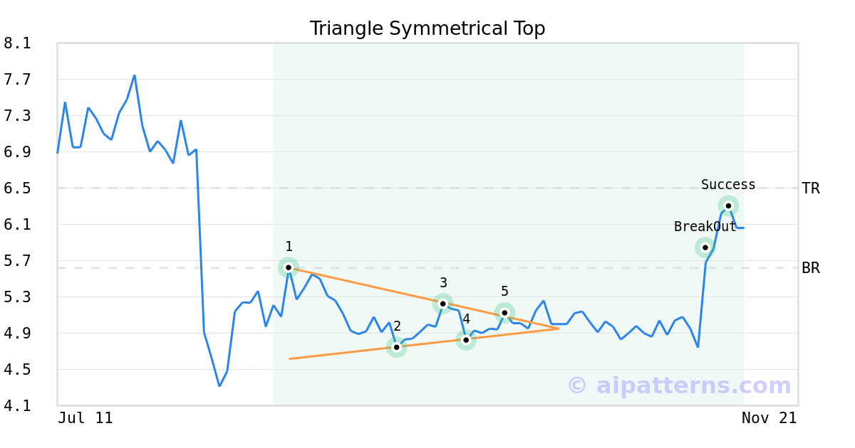On October 02, 2025, A.I.dvisor detected a Triangle Symmetrical Top Pattern (Bullish) for electroCore (ECOR, $5.12). On November 06, 2025, A.I.dvisor confirmed the Bullish pattern, setting a target price of $6.50. 5 days later, on November 11, 2025, ECOR reached the target price resulting in a +2 for traders who took a long position in the stock.