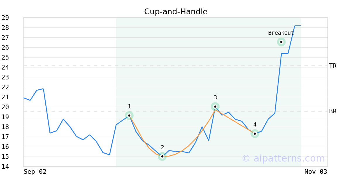 On October 21, 2025, A.I.dvisor detected a Cup-and-Handle Pattern (Bullish) for Empresa Distribuidora Y Comercializadora Norte SA (EDN, $17.31). On October 27, 2025, A.I.dvisor confirmed the Bullish pattern, setting a target price of $24.15. On October 27, 2025, EDN reached the target price resulting in a +5 for traders who took a long position in the stock.