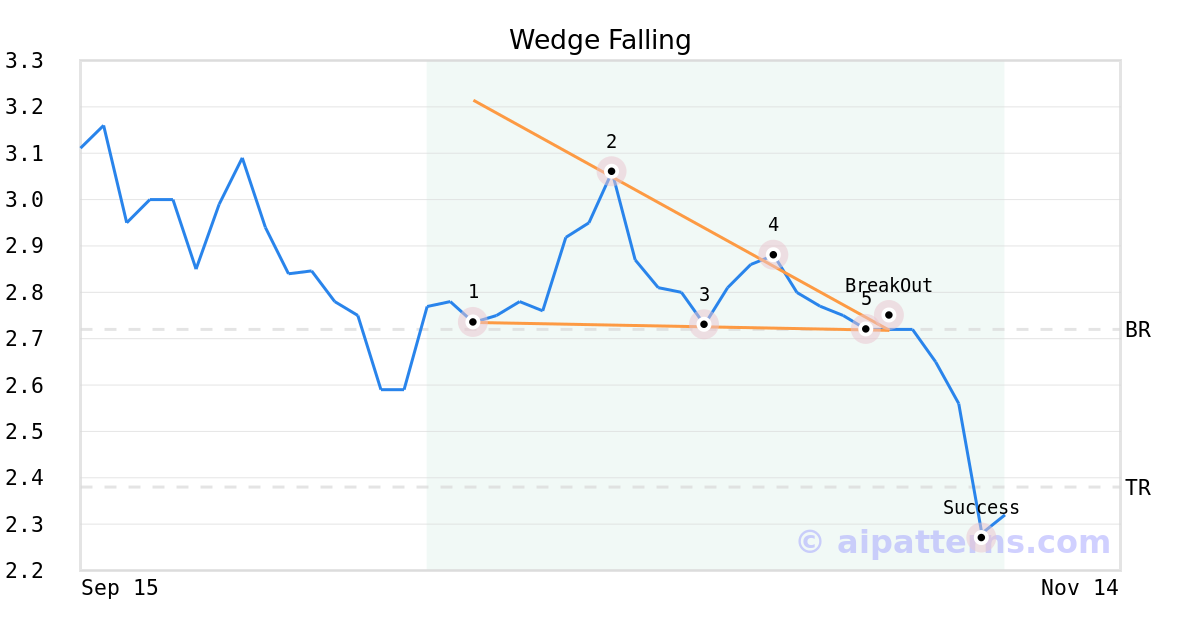 On October 31, 2025, A.I.dvisor detected a Wedge Falling Pattern (Bearish) for Energy Focus (EFOI, $2.72). 3 days later, on November 03, 2025, A.I.dvisor confirmed the Bearish pattern, setting a target price of the stock. On November 07, 2025, the stock hit the target price of $2.38 – resulting in a +1 gain for traders who shorted the stock on the pattern detection date.