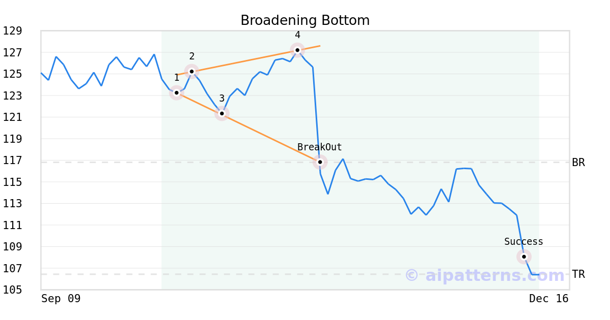 On October 30, 2025, A.I.dvisor detected a Broadening Bottom Pattern (Bearish) for Encompass Health Corp (EHC, $116.81). On October 30, 2025, A.I.dvisor confirmed the Bearish pattern, setting a target price of the stock. On December 09, 2025, the stock hit the target price of $106.44 – resulting in a gain for traders who shorted the stock on the pattern detection date.