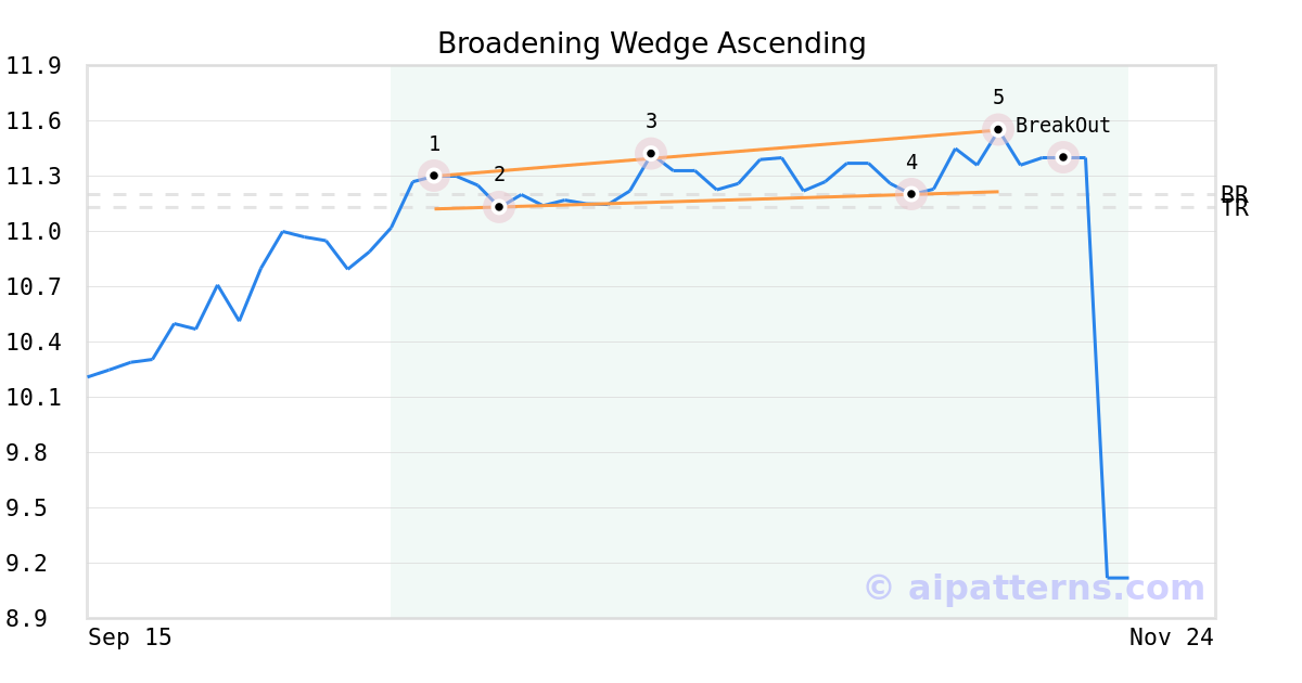 On November 12, 2025, A.I.dvisor detected a Broadening Wedge Ascending Pattern (Bearish) for Eltek Ltd (ELTK, $11.55). 5 days later, on November 17, 2025, A.I.dvisor confirmed the Bearish pattern, setting a target price of the stock. On November 17, 2025, the stock hit the target price of $11.13 – resulting in a gain for traders who shorted the stock on the pattern detection date.