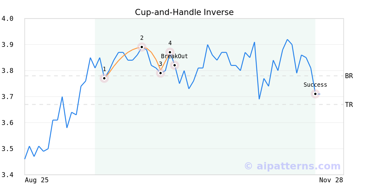 On October 08, 2025, A.I.dvisor detected a Cup-and-Handle Inverse Pattern (Bearish) for Enel Chile SA (ENIC, $3.87). 1 day later, on October 09, 2025, A.I.dvisor confirmed the Bearish pattern, setting a target price of the stock. On November 20, 2025, the stock hit the target price of $3.67 – resulting in a gain for traders who shorted the stock on the pattern detection date.