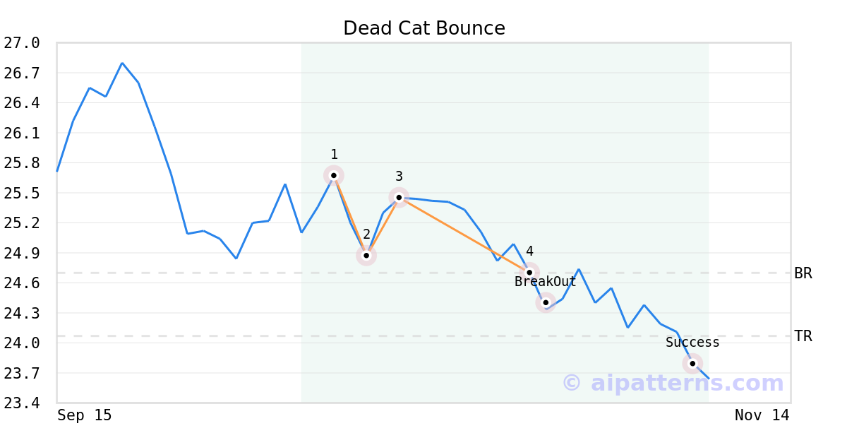 On October 24, 2025, A.I.dvisor detected a Dead Cat Bounce Pattern (Bearish) for iShares MSCI Philippines ETF (EPHE, $24.70). 3 days later, on October 27, 2025, A.I.dvisor confirmed the Bearish pattern, setting a target price of the stock. On November 07, 2025, the stock hit the target price of $24.07 – resulting in a gain for traders who shorted the stock on the pattern detection date.