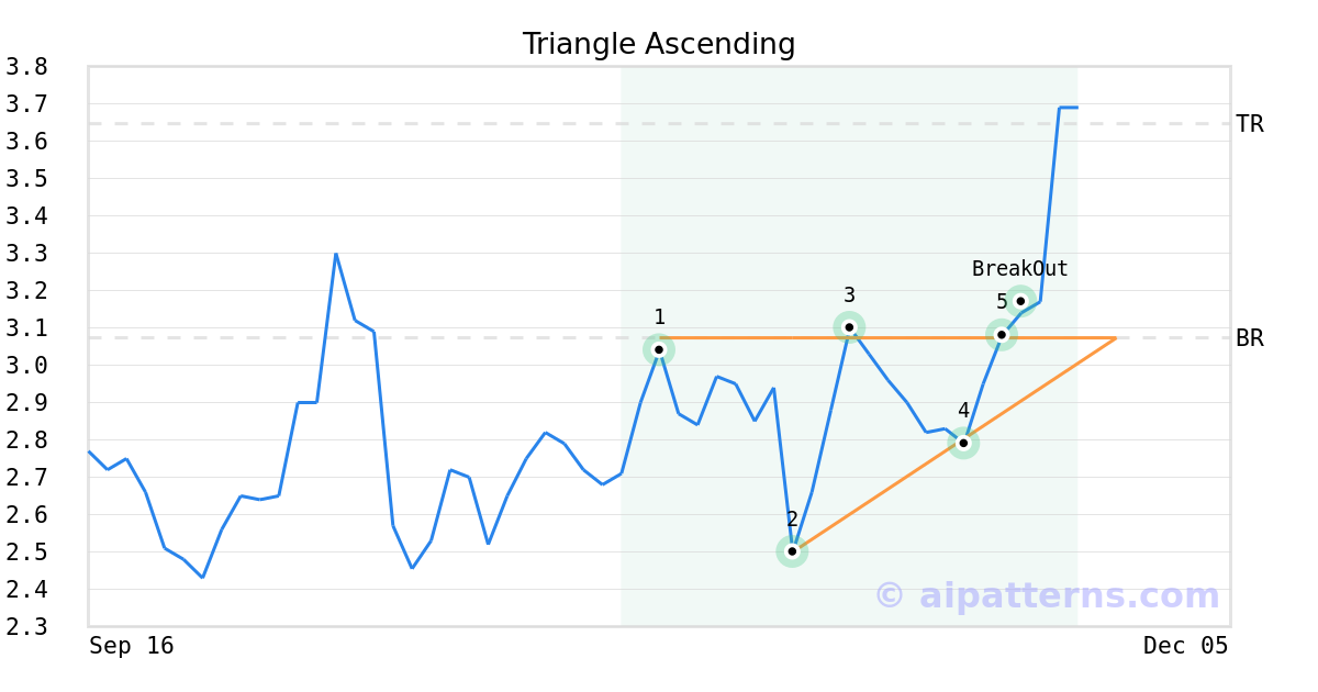 On November 21, 2025, A.I.dvisor detected a Triangle Ascending Pattern (Bullish) for Esperion Therapeutics (ESPR, $3.08). On November 24, 2025, A.I.dvisor confirmed the Bullish pattern, setting a target price of $3.65. On November 24, 2025, ESPR reached the target price resulting in a for traders who took a long position in the stock.