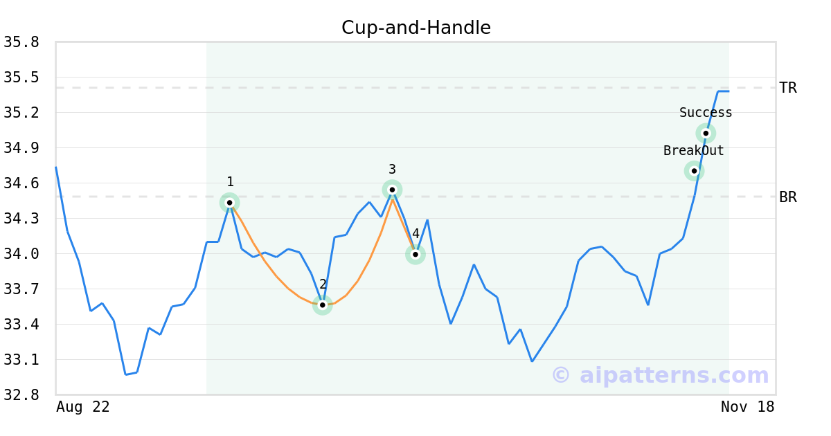 On October 07, 2025, A.I.dvisor detected a Cup-and-Handle Pattern (Bullish) for iShares MSCI Europe Financials ETF (EUFN, $33.99). On November 10, 2025, A.I.dvisor confirmed the Bullish pattern, setting a target price of $35.41. 1 day later, on November 11, 2025, EUFN reached the target price resulting in a for traders who took a long position in the stock.