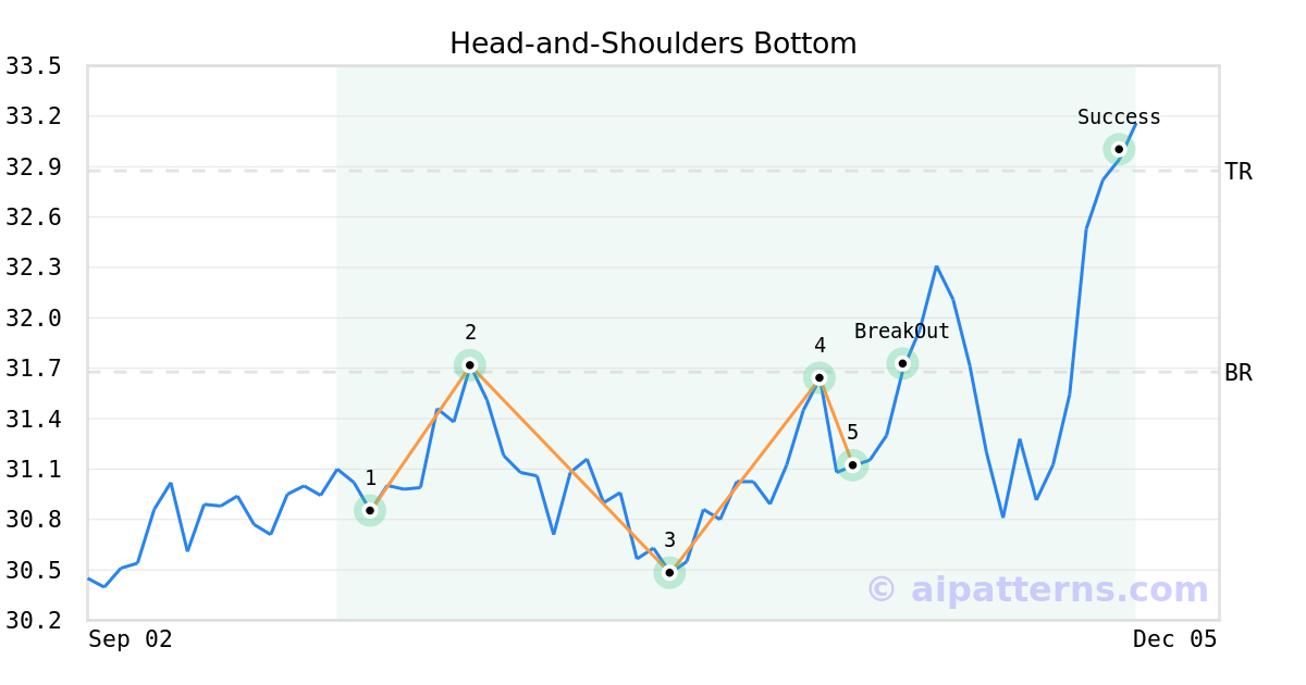 On November 05, 2025, A.I.dvisor detected a Head-and-Shoulders Bottom Pattern (Bullish) for iShares MSCI Austria ETF (EWO, $31.12). On November 10, 2025, A.I.dvisor confirmed the Bullish pattern, setting a target price of $32.88. 18 days later, on November 28, 2025, EWO reached the target price resulting in a for traders who took a long position in the stock.