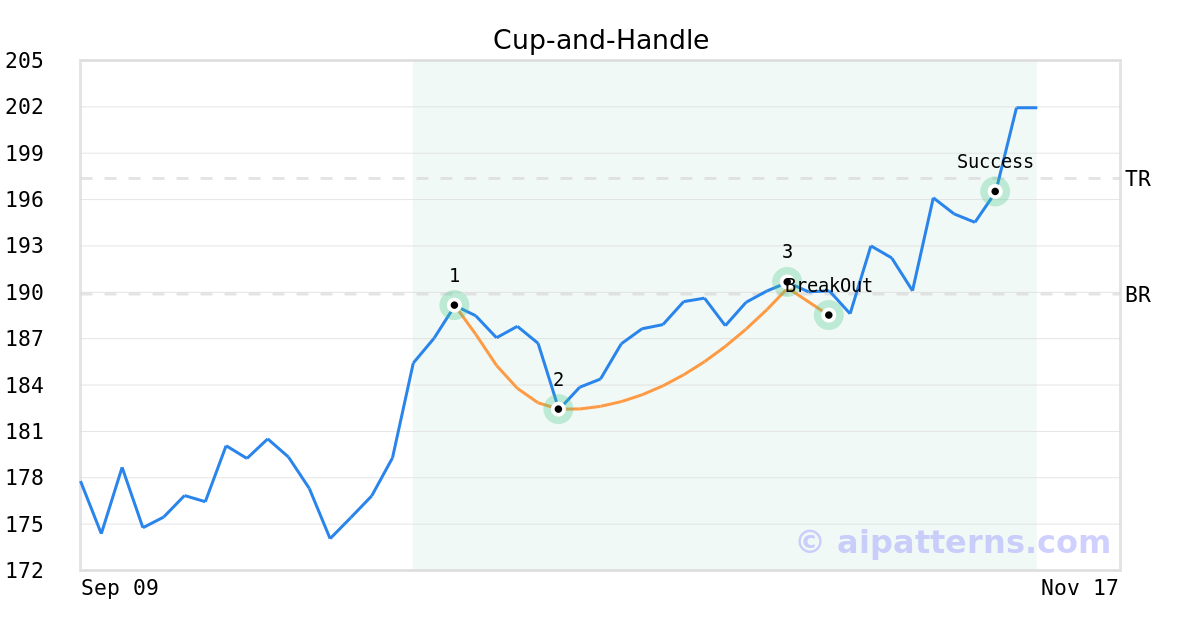 On October 29, 2025, A.I.dvisor detected a Cup-and-Handle Pattern (Bullish) for First Trust NYSE Arca Biotech ETF (FBT, $188.50). On October 29, 2025, A.I.dvisor confirmed the Bullish pattern, setting a target price of $197.37. 12 days later, on November 10, 2025, FBT reached the target price resulting in a for traders who took a long position in the stock.