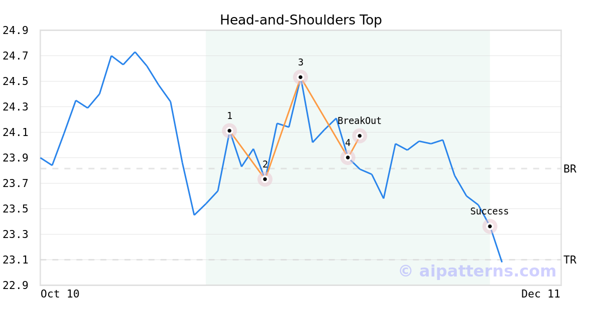 On November 18, 2025, A.I.dvisor detected a Head-and-Shoulders Top Pattern (Bearish) for Four Corners Property Trust (FCPT, $24.07). On November 18, 2025, A.I.dvisor confirmed the Bearish pattern, setting a target price of the stock. On December 04, 2025, the stock hit the target price of $23.10 – resulting in a gain for traders who shorted the stock on the pattern detection date.