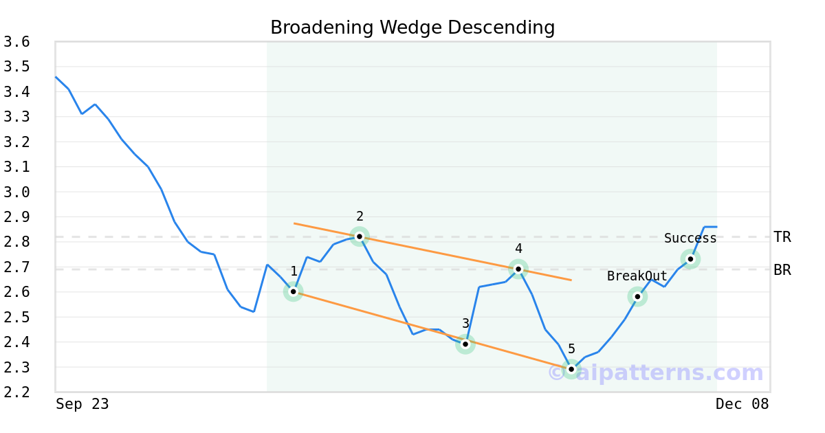On November 17, 2025, A.I.dvisor detected a Broadening Wedge Descending Pattern (Bullish) for Full House Resorts (FLL, $2.29). On November 24, 2025, A.I.dvisor confirmed the Bullish pattern, setting a target price of $2.82. 7 days later, on December 01, 2025, FLL reached the target price resulting in a +1 for traders who took a long position in the stock.