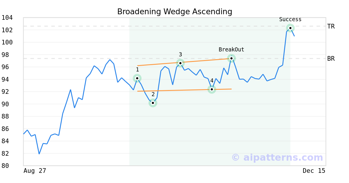 On November 11, 2025, A.I.dvisor detected a Broadening Wedge Ascending Pattern (Bullish) for Fomento Economico Mexicano SAB DE CV (FMX, $97.37). On November 11, 2025, A.I.dvisor confirmed the Bullish pattern, setting a target price of $102.61. 22 days later, on December 03, 2025, FMX reached the target price resulting in a for traders who took a long position in the stock.