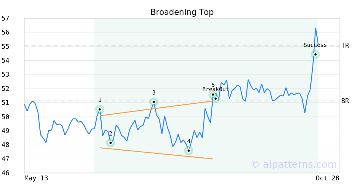 On August 22, 2025, A.I.dvisor detected a Broadening Top Pattern (Bullish) for First Industrial Realty Trust (FR, $51.12). On August 25, 2025, A.I.dvisor confirmed the Bullish pattern, setting a target price of $55.08. 52 days later, on October 16, 2025, FR reached the target price resulting in a for traders who took a long position in the stock.