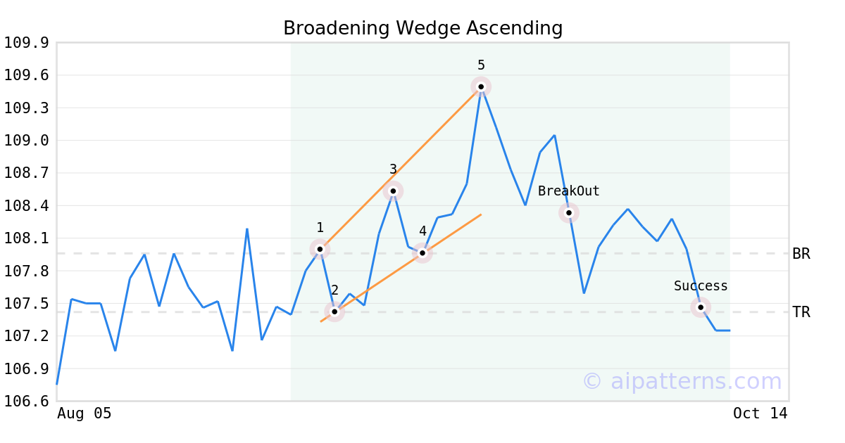 On September 16, 2025, A.I.dvisor detected a Broadening Wedge Ascending Pattern (Bearish) for Invesco CurrencyShares® Euro Currency (FXE, $109.43). 8 days later, on September 24, 2025, A.I.dvisor confirmed the Bearish pattern, setting a target price of the stock. On October 07, 2025, the stock hit the target price of $107.42 – resulting in a gain for traders who shorted the stock on the pattern detection date.