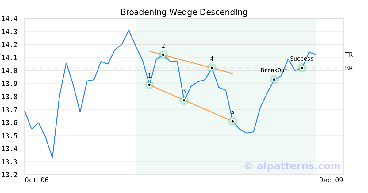 On November 17, 2025, A.I.dvisor detected a Broadening Wedge Descending Pattern (Bullish) for Golub Capital BDC (GBDC, $13.61). On November 25, 2025, A.I.dvisor confirmed the Bullish pattern, setting a target price of $14.12. 7 days later, on December 02, 2025, GBDC reached the target price resulting in a for traders who took a long position in the stock.