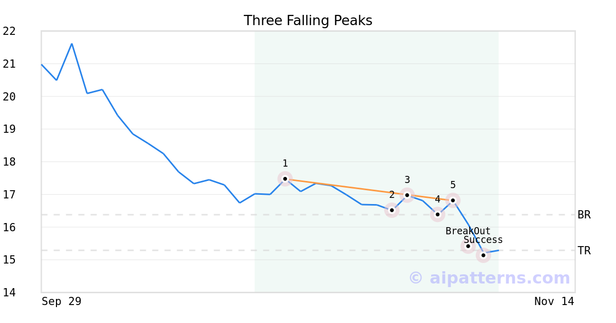 On November 05, 2025, A.I.dvisor detected a Three Falling Peaks Pattern (Bearish) for GEO Group (The) (GEO, $16.81). 1 day later, on November 06, 2025, A.I.dvisor confirmed the Bearish pattern, setting a target price of the stock. On November 07, 2025, the stock hit the target price of $15.29 – resulting in a gain for traders who shorted the stock on the pattern detection date.