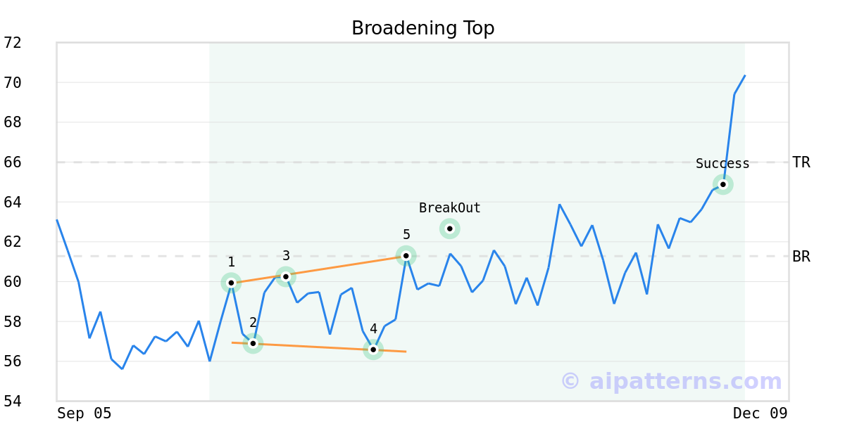 On October 21, 2025, A.I.dvisor detected a Broadening Top Pattern (Bullish) for Globant SA (GLOB, $61.28). On October 27, 2025, A.I.dvisor confirmed the Bullish pattern, setting a target price of $65.99. 36 days later, on December 02, 2025, GLOB reached the target price resulting in a for traders who took a long position in the stock.