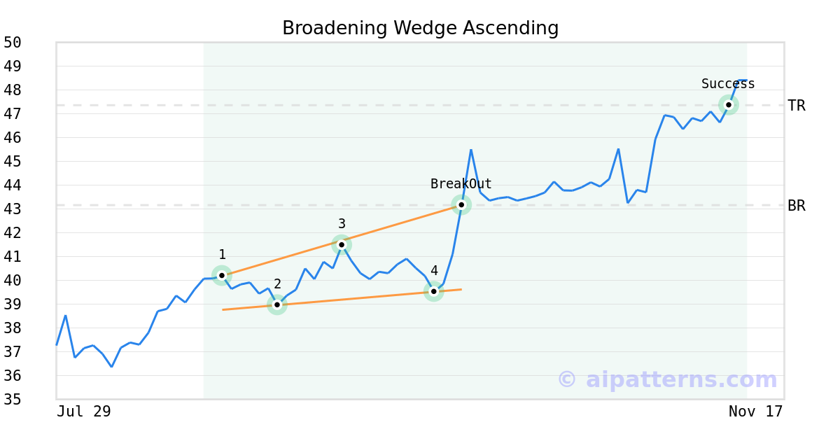 On September 30, 2025, A.I.dvisor detected a Broadening Wedge Ascending Pattern (Bullish) for GSK plc (GSK, $43.16). On September 30, 2025, A.I.dvisor confirmed the Bullish pattern, setting a target price of $47.36. 41 days later, on November 10, 2025, GSK reached the target price resulting in a for traders who took a long position in the stock.