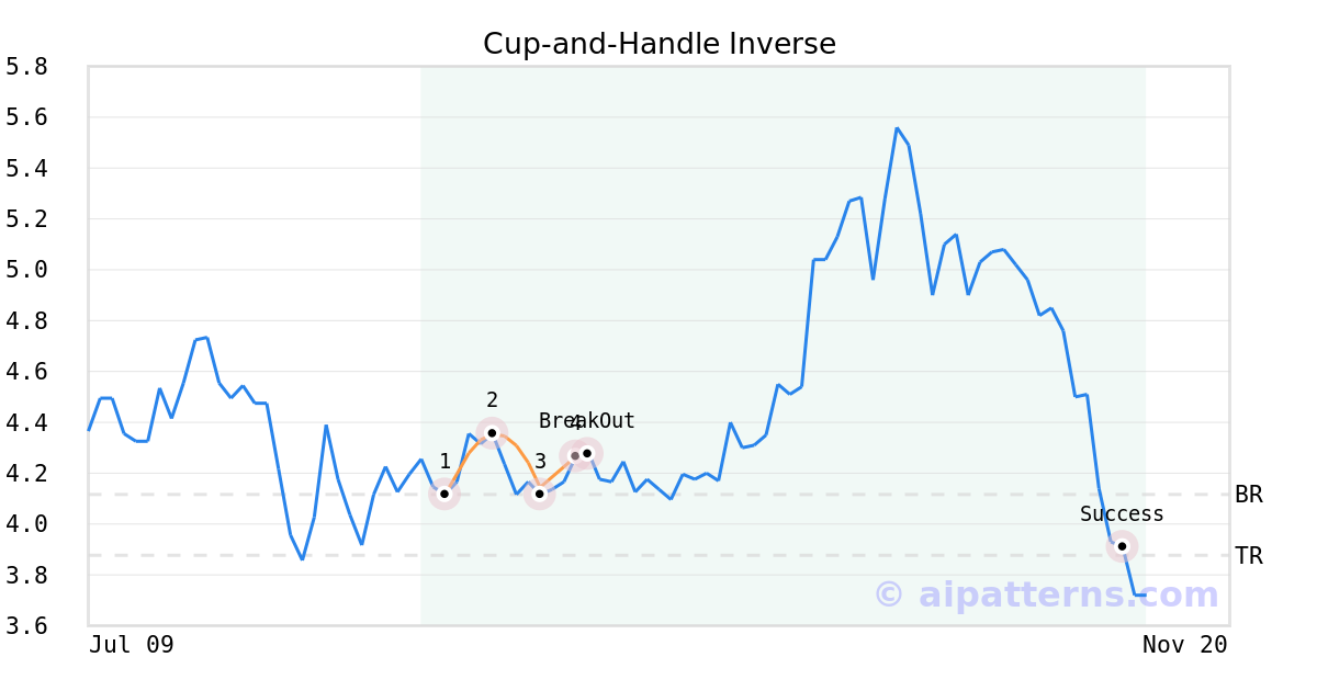 On September 05, 2025, A.I.dvisor detected a Cup-and-Handle Inverse Pattern (Bearish) for Ferroglobe PLC (GSM, $4.27). 3 days later, on September 08, 2025, A.I.dvisor confirmed the Bearish pattern, setting a target price of the stock. On November 10, 2025, the stock hit the target price of $3.88 – resulting in a gain for traders who shorted the stock on the pattern detection date.