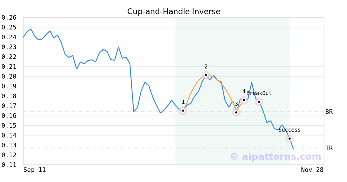 On November 08, 2025, A.I.dvisor detected a Cup-and-Handle Inverse Pattern (Bearish) for Hedera cryptocurrency (HBAR.X, $0.175494). 4 days later, on November 12, 2025, A.I.dvisor confirmed the Bearish pattern, setting a target price of the stock. On November 20, 2025, the stock hit the target price of $0.127170 – resulting in a +2 gain for traders who shorted the stock on the pattern detection date.