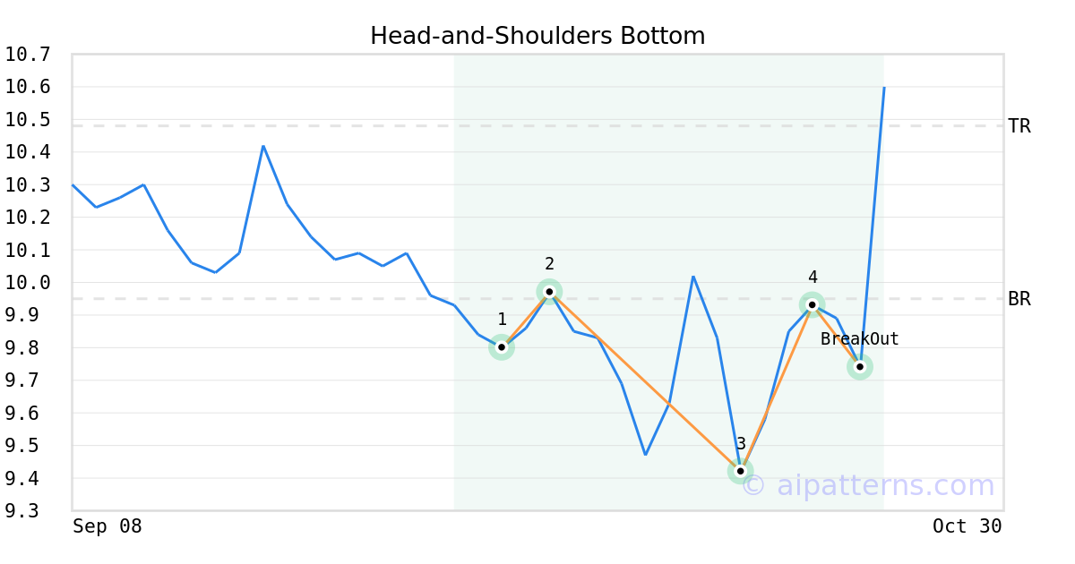 On October 23, 2025, A.I.dvisor detected a Head-and-Shoulders Bottom Pattern (Bullish) for Heritage Commerce Corp (HTBK, $9.74). On October 23, 2025, A.I.dvisor confirmed the Bullish pattern, setting a target price of $10.48. On October 23, 2025, HTBK reached the target price resulting in a for traders who took a long position in the stock.