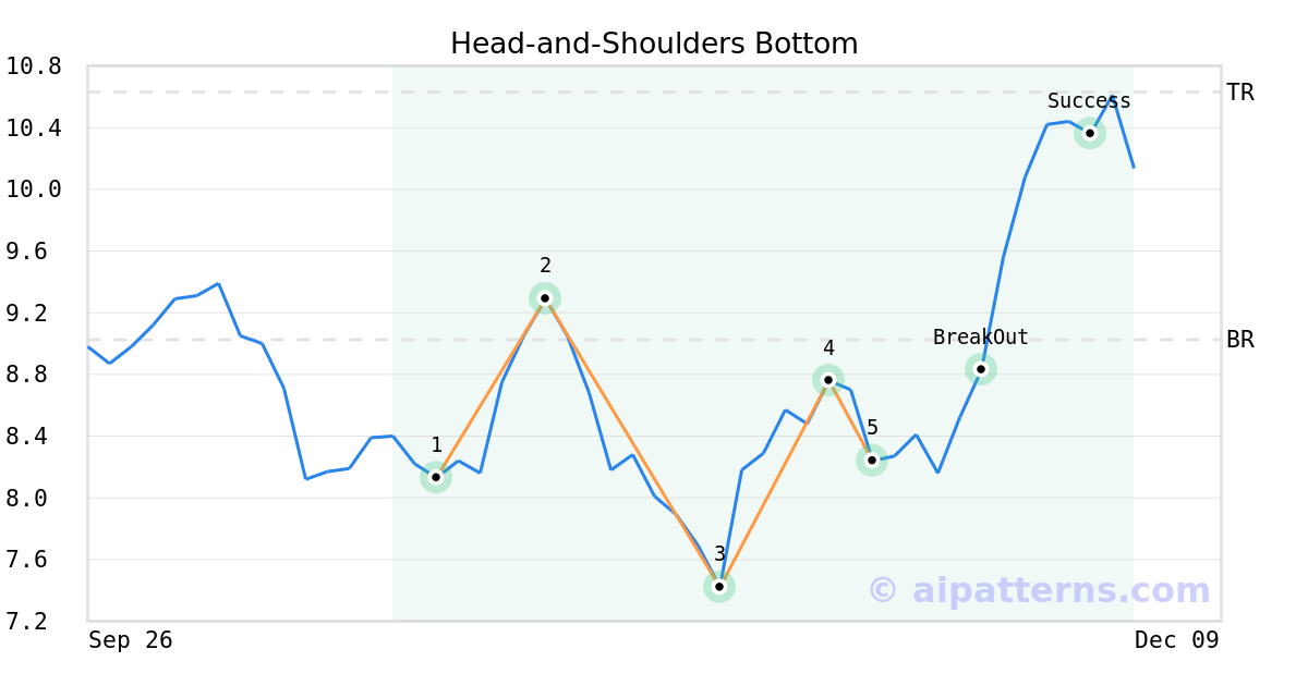 On November 17, 2025, A.I.dvisor detected a Head-and-Shoulders Bottom Pattern (Bullish) for Huntsman Corp (HUN, $8.24). On November 24, 2025, A.I.dvisor confirmed the Bullish pattern, setting a target price of $10.63. 8 days later, on December 02, 2025, HUN reached the target price resulting in a +2 for traders who took a long position in the stock.