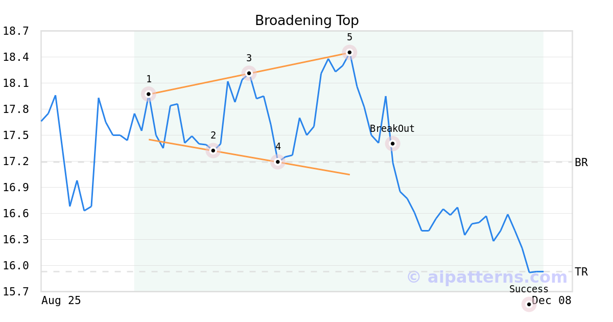 On October 24, 2025, A.I.dvisor detected a Broadening Top Pattern (Bearish) for Hurco Companies (HURC, $18.45). 10 days later, on November 03, 2025, A.I.dvisor confirmed the Bearish pattern, setting a target price of the stock. On December 01, 2025, the stock hit the target price of $15.93 – resulting in a +1 gain for traders who shorted the stock on the pattern detection date.