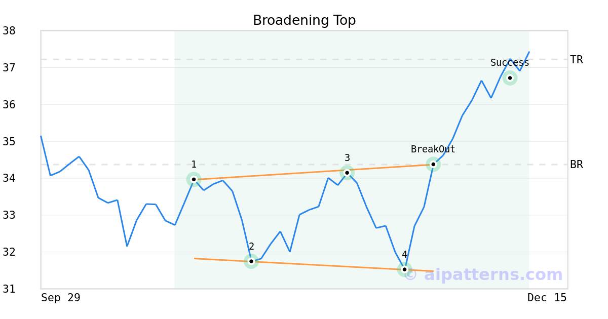 On November 25, 2025, A.I.dvisor detected a Broadening Top Pattern (Bullish) for IAC (IAC, $34.37). On November 25, 2025, A.I.dvisor confirmed the Bullish pattern, setting a target price of $37.22. 13 days later, on December 08, 2025, IAC reached the target price resulting in a for traders who took a long position in the stock.