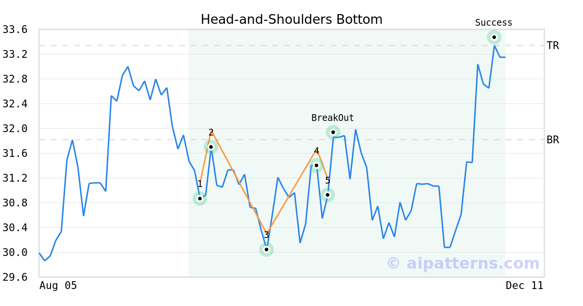 On October 17, 2025, A.I.dvisor detected a Head-and-Shoulders Bottom Pattern (Bullish) for Independent Bank Corp (IBCP, $30.92). On October 20, 2025, A.I.dvisor confirmed the Bullish pattern, setting a target price of $33.34. 42 days later, on December 01, 2025, IBCP reached the target price resulting in a for traders who took a long position in the stock.
