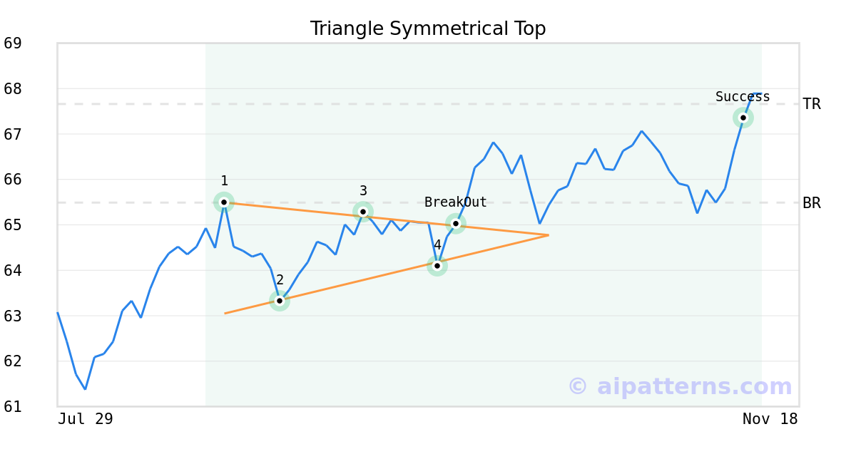 On September 29, 2025, A.I.dvisor detected a Triangle Symmetrical Top Pattern (Bullish) for iShares Europe ETF (IEV, $65.02). On September 29, 2025, A.I.dvisor confirmed the Bullish pattern, setting a target price of $67.66. 43 days later, on November 11, 2025, IEV reached the target price resulting in a for traders who took a long position in the stock.