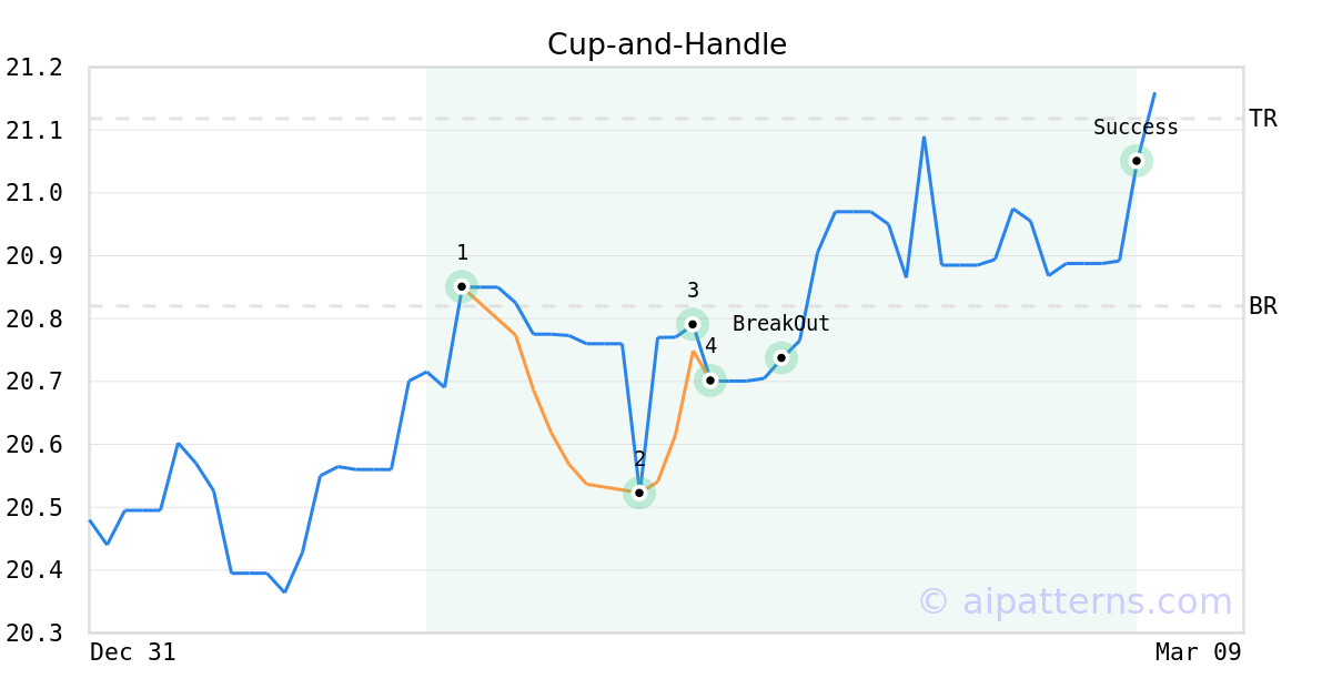 On February 07, 2025, A.I.dvisor detected a Cup-and-Handle Pattern (Bullish) for VanEck Intl Hi Yld Bd ETF (IHY, $20.63). On February 11, 2025, A.I.dvisor confirmed the Bullish pattern, setting a target price of $21.12. 21 days later, on March 04, 2025, IHY reached the target price resulting in a for traders who took a long position in the stock.