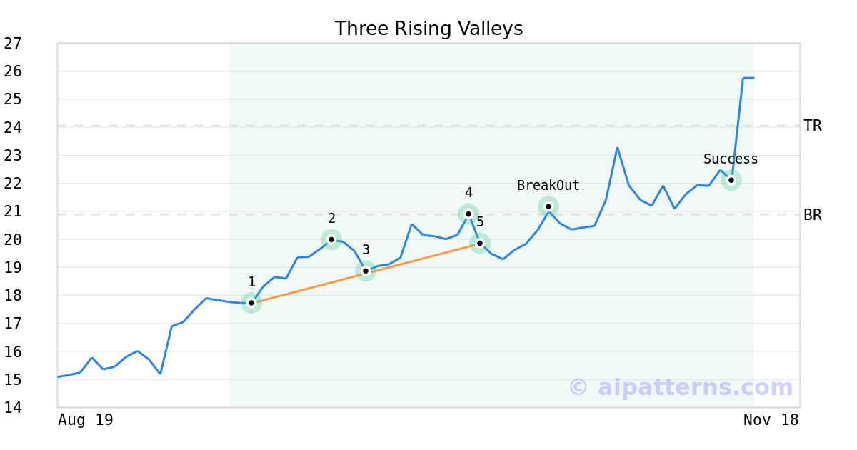 On October 10, 2025, A.I.dvisor detected a Three Rising Valleys Pattern (Bullish) for ChipMOS TECHNOLOGIES (IMOS, $19.85). On October 20, 2025, A.I.dvisor confirmed the Bullish pattern, setting a target price of $24.06. 22 days later, on November 11, 2025, IMOS reached the target price resulting in a +1 for traders who took a long position in the stock.