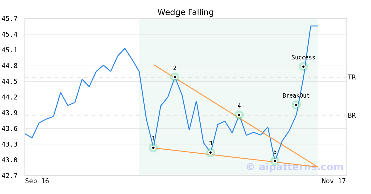 On November 04, 2025, A.I.dvisor detected a Wedge Falling Pattern (Bullish) for Horizon Kinetics Inflation Bnfcrs ETF (INFL, $42.98). On November 07, 2025, A.I.dvisor confirmed the Bullish pattern, setting a target price of $44.58. 3 days later, on November 10, 2025, INFL reached the target price resulting in a for traders who took a long position in the stock.