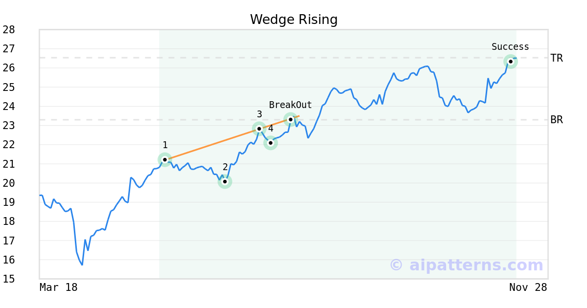 On July 24, 2025, A.I.dvisor detected a Wedge Rising Pattern (Bullish) for ING Groep NV (ING, $23.30). On July 24, 2025, A.I.dvisor confirmed the Bullish pattern, setting a target price of $26.53. 110 days later, on November 11, 2025, ING reached the target price resulting in a +1 for traders who took a long position in the stock.