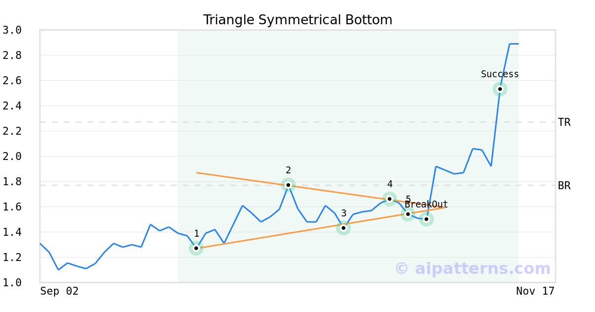 On October 28, 2025, A.I.dvisor detected a Triangle Symmetrical Bottom Pattern (Bullish) for Ironwood Pharmaceuticals (IRWD, $1.54). On October 30, 2025, A.I.dvisor confirmed the Bullish pattern, setting a target price of $2.27. 11 days later, on November 10, 2025, IRWD reached the target price resulting in a +6 for traders who took a long position in the stock.