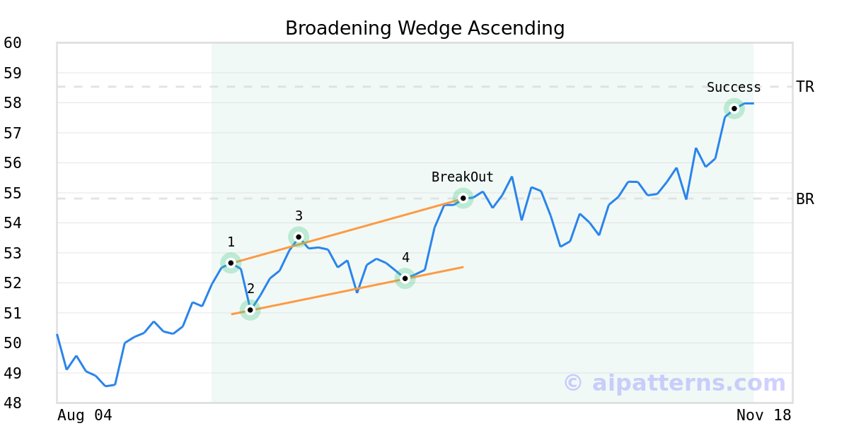 On October 02, 2025, A.I.dvisor detected a Broadening Wedge Ascending Pattern (Bullish) for VanEck Israel ETF (ISRA, $54.81). On October 02, 2025, A.I.dvisor confirmed the Bullish pattern, setting a target price of $58.53. 40 days later, on November 11, 2025, ISRA reached the target price resulting in a for traders who took a long position in the stock.