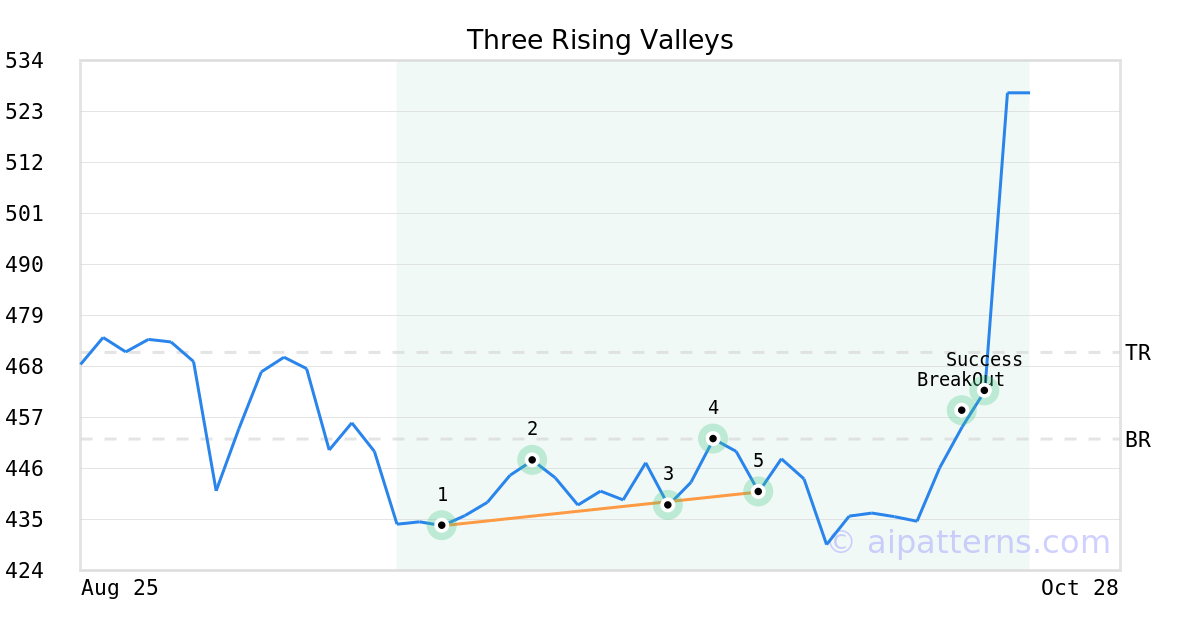 On October 07, 2025, A.I.dvisor detected a Three Rising Valleys Pattern (Bullish) for Intuitive Surgical (ISRG, $440.94). On October 20, 2025, A.I.dvisor confirmed the Bullish pattern, setting a target price of $471.04. 1 day later, on October 21, 2025, ISRG reached the target price resulting in a for traders who took a long position in the stock.