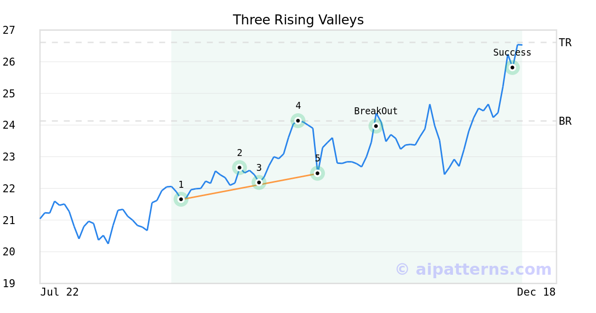 On October 10, 2025, A.I.dvisor detected a Three Rising Valleys Pattern (Bullish) for Invesco Ltd (IVZ, $22.47). On October 28, 2025, A.I.dvisor confirmed the Bullish pattern, setting a target price of $26.61. 41 days later, on December 08, 2025, IVZ reached the target price resulting in a +1 for traders who took a long position in the stock.