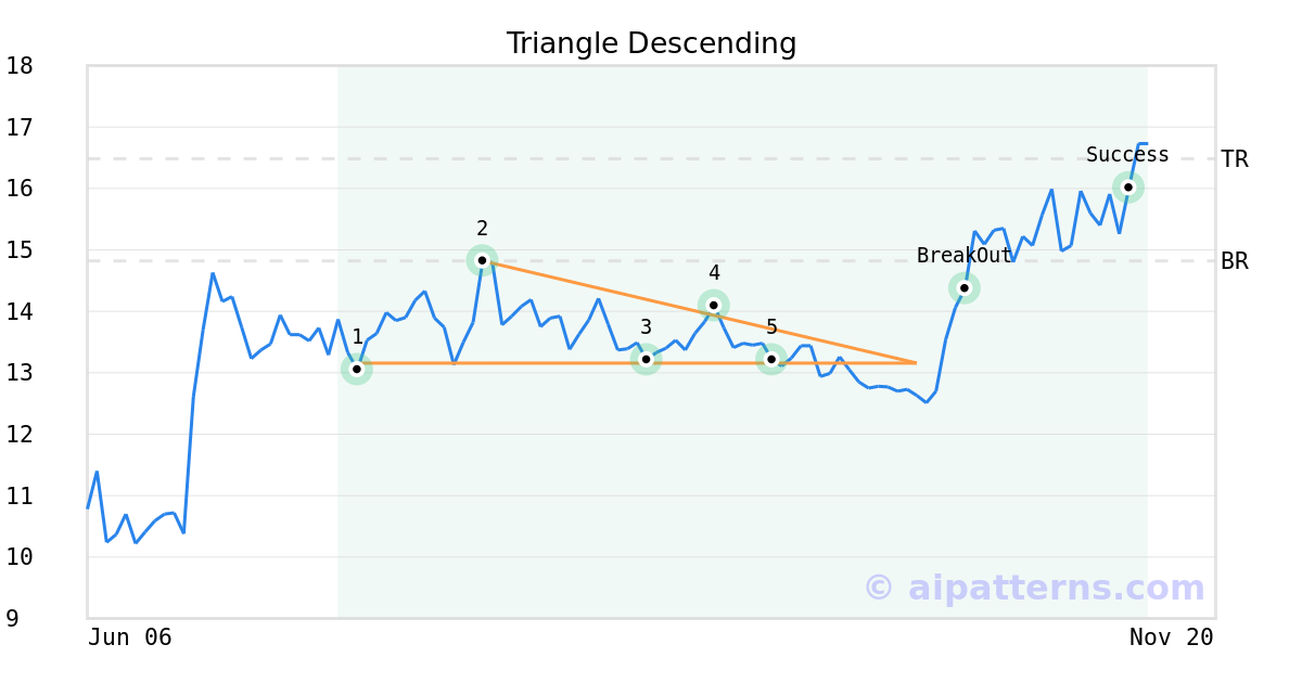 On September 18, 2025, A.I.dvisor detected a Triangle Descending Pattern (Bullish) for Korea Electric Power Corp (KEP, $13.21). On October 16, 2025, A.I.dvisor confirmed the Bullish pattern, setting a target price of $16.48. 25 days later, on November 10, 2025, KEP reached the target price resulting in a +2 for traders who took a long position in the stock.